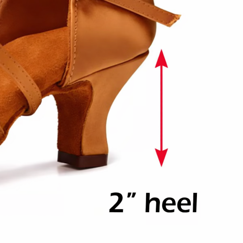 These stylish rhythm or latin dance shoes come in 4 colors. Black, white, light tan and dark tan. The fabric is a luxurious satin and the sole is genuine suede. It features a tapered slip heel for a sleek look on the dance floor.