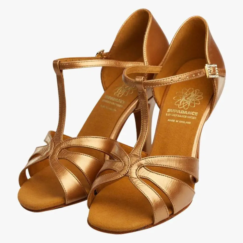 High-performance Latin sandal in Dark Tan Sateen Leather, designed for elegance and expert control on the dancefloor. Features a T-bar, with a secure hook buckle fastening. The Sateen Leather finish offers the lustrous look of satin while blending beautifully with tanned skin.