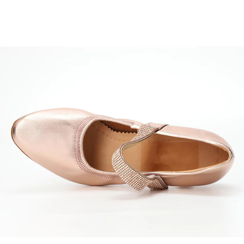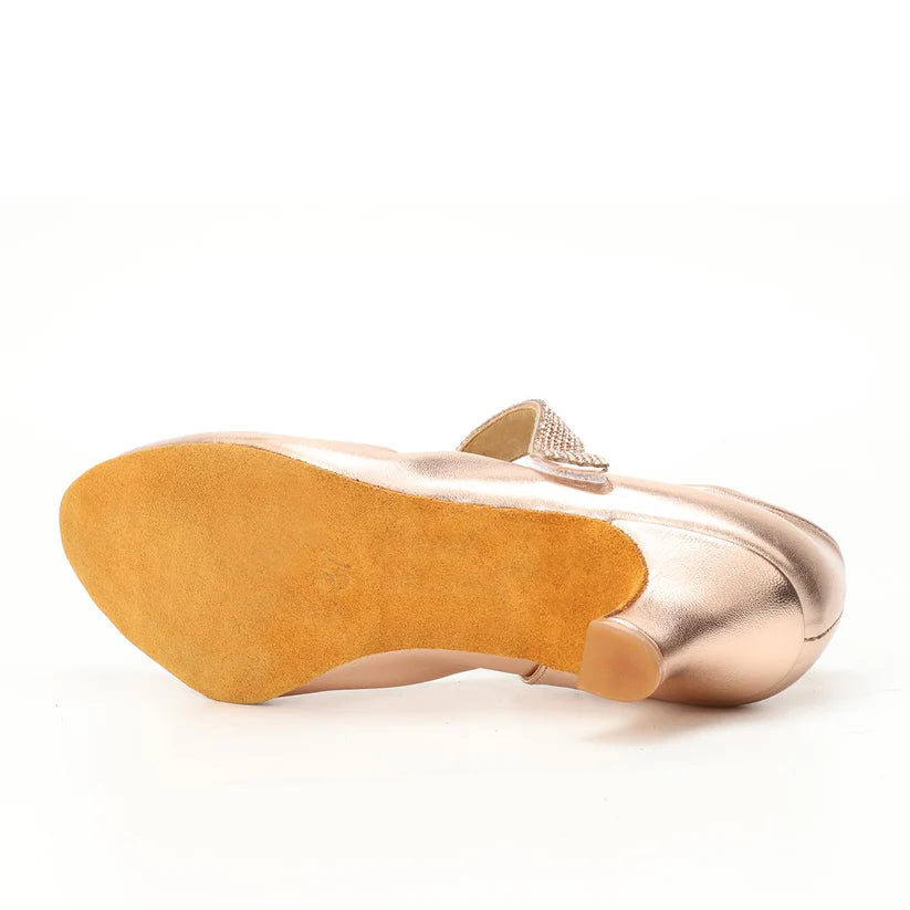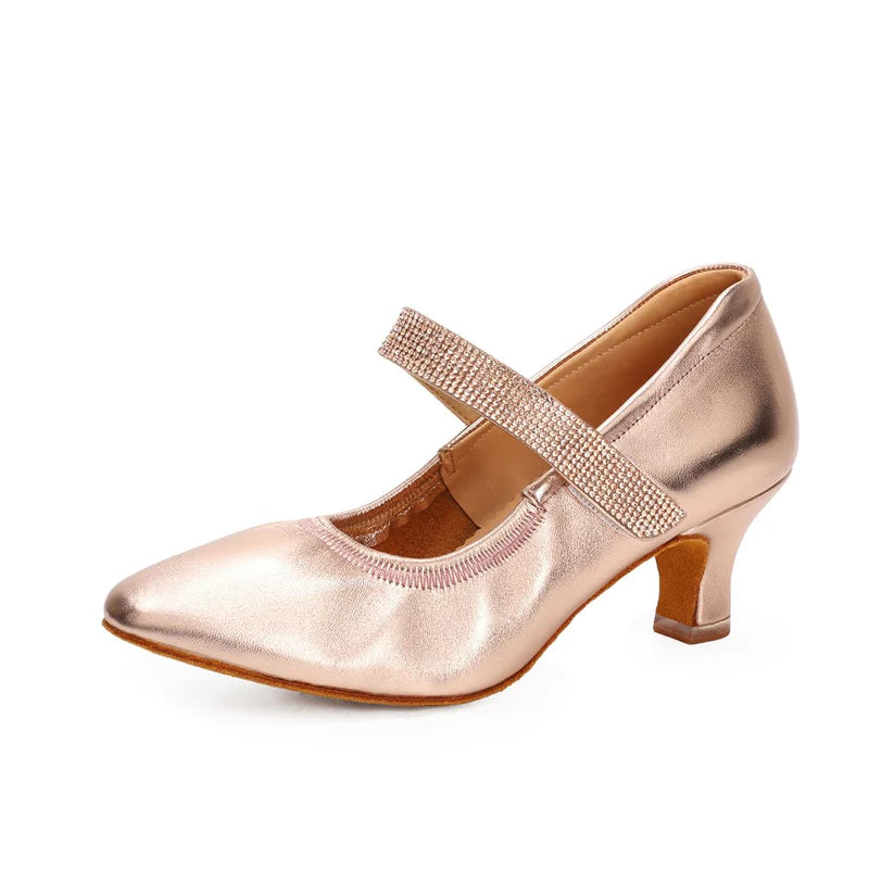 - DANCE SHOE DESIGN: Professional Mary Jane style ballroom dance shoes with elegant metallic rose gold finish and secure strap closure