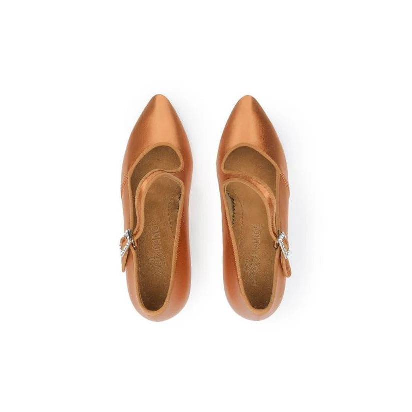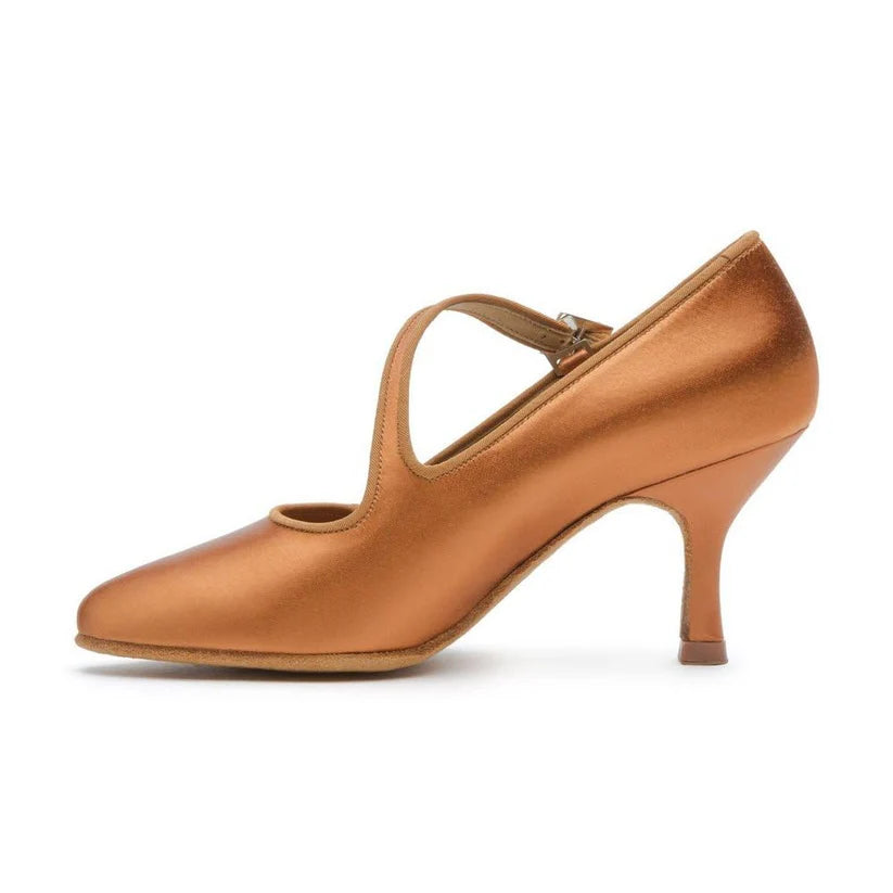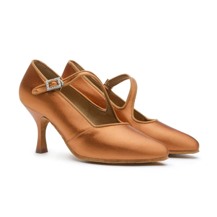 - ELEGANT DESIGN: Professional ballroom dance shoe featuring a sophisticated dark tan satin finish and classic cross-strap design for secure fit