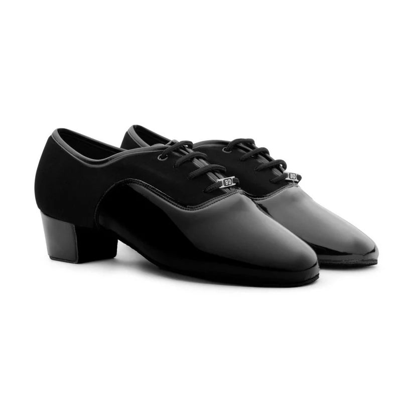 Step into the rhythm with these sophisticated BD Latin dance shoes designed specifically for young dancers. These black leather Oxford-style shoes feature a classic lace-up design that ensures a secure and adjustable fit during performances and practice sessions. The well-crafted block heel provides essential stability and balance while maintaining the perfect height for Latin dance movements. The sleek black leather construction offers both durability and style, making these shoes ideal for competitions, performances, or dance classes. The thoughtful design combines functionality with elegance, allowing young dancers to move with confidence and precision across the dance floor. These shoes represent the perfect blend of traditional craftsmanship and dance-specific engineering, supporting proper technique development while ensuring comfort during extended wear. Whether practicing the cha-cha, rumba, or samba, these shoes deliver the reliability and style needed for Latin dance excellence.