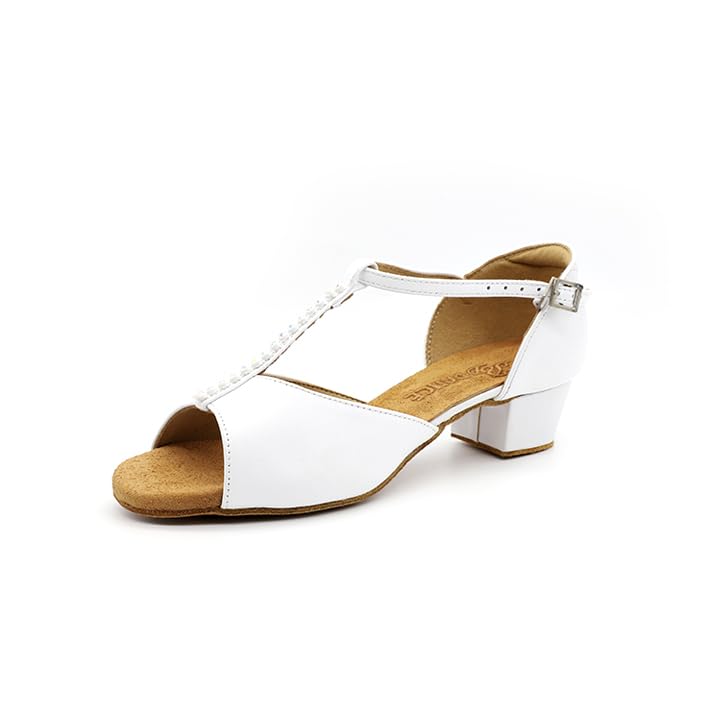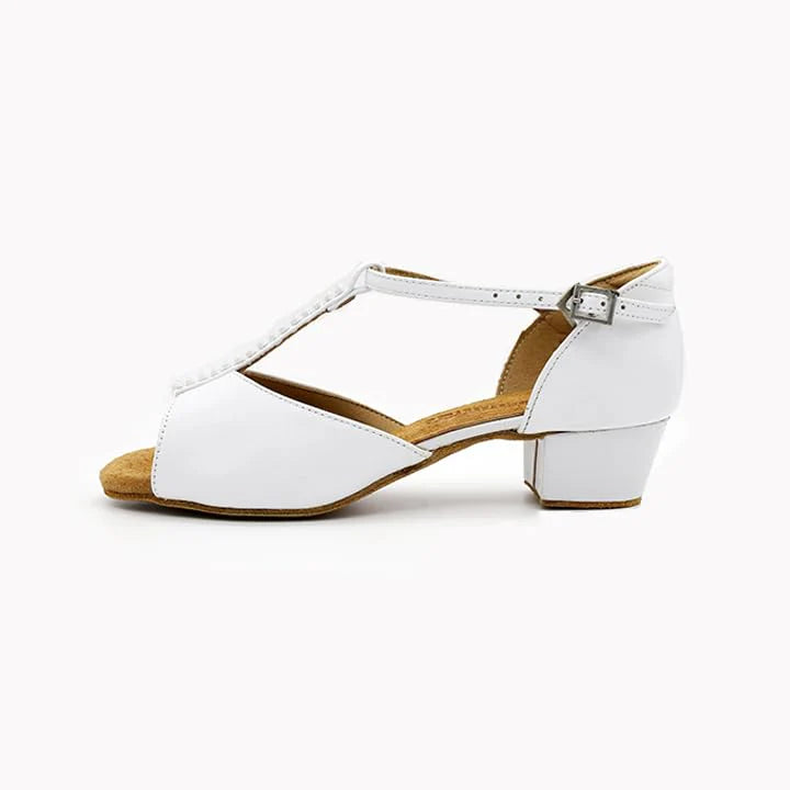 - DESIGN: Classic white peep-toe dance sandals with T-strap design and decorative details, perfect for ballroom and Latin dance