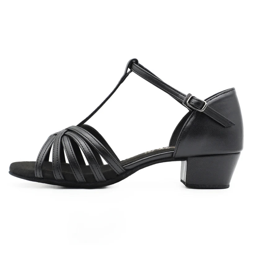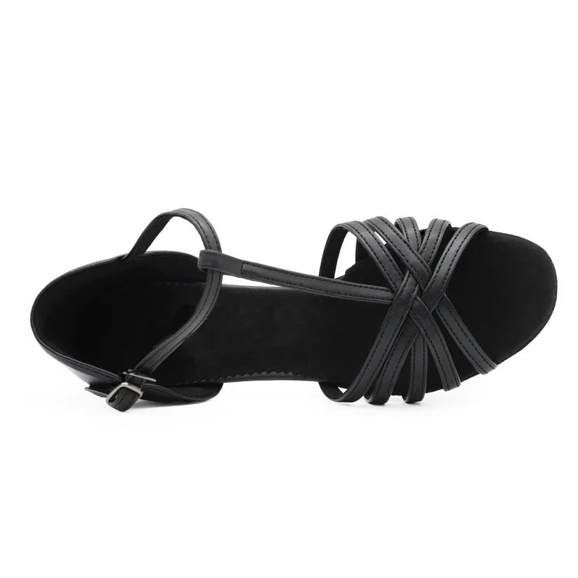 DESIGN: Elegant strappy dance sandals featuring intricate cross-strap pattern and secure ankle buckle closure for stability during movement