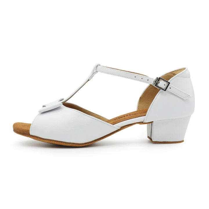 Step into grace with these elegant white Latin dance sandals designed specifically for young dancers. These beautiful ballroom practice shoes feature a comfortable low block heel that provides stability and confidence while learning dance steps. Crafted from quality leather with a soft suede sole, these sandals offer the perfect blend of durability and flexibility needed for dance practice. The secure ankle strap with buckle closure ensures a snug fit during movement, while the cushioned footbed provides comfort through hours of practice. The classic white color makes these shoes versatile for various dance occasions and costumes. The thoughtfully designed T-strap adds both style and support, making these sandals ideal for Latin dance, ballroom practice, or performance. Perfect for beginning and intermediate dancers, these shoes help develop proper technique while maintaining comfort and style.