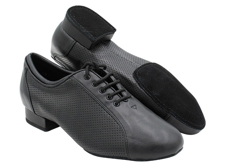 The Very Fine Black Perforated Leather Ladies Practice Dance Shoe 1119 In Stock features a unique design with perforated leather on either side of the shoe. It also includes a lace-up closure on the front for a secure fit. The shoe boasts a suede sole and a cushioned insole for shock absorption and comfort, while the minimal shank board provides added support and flexibility.