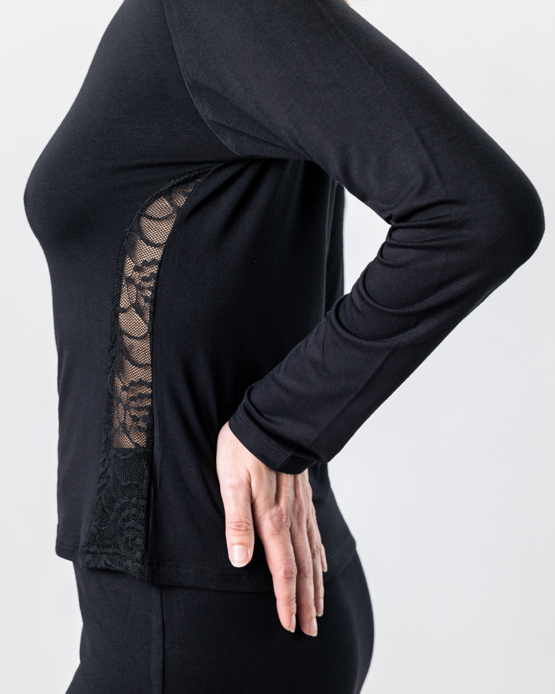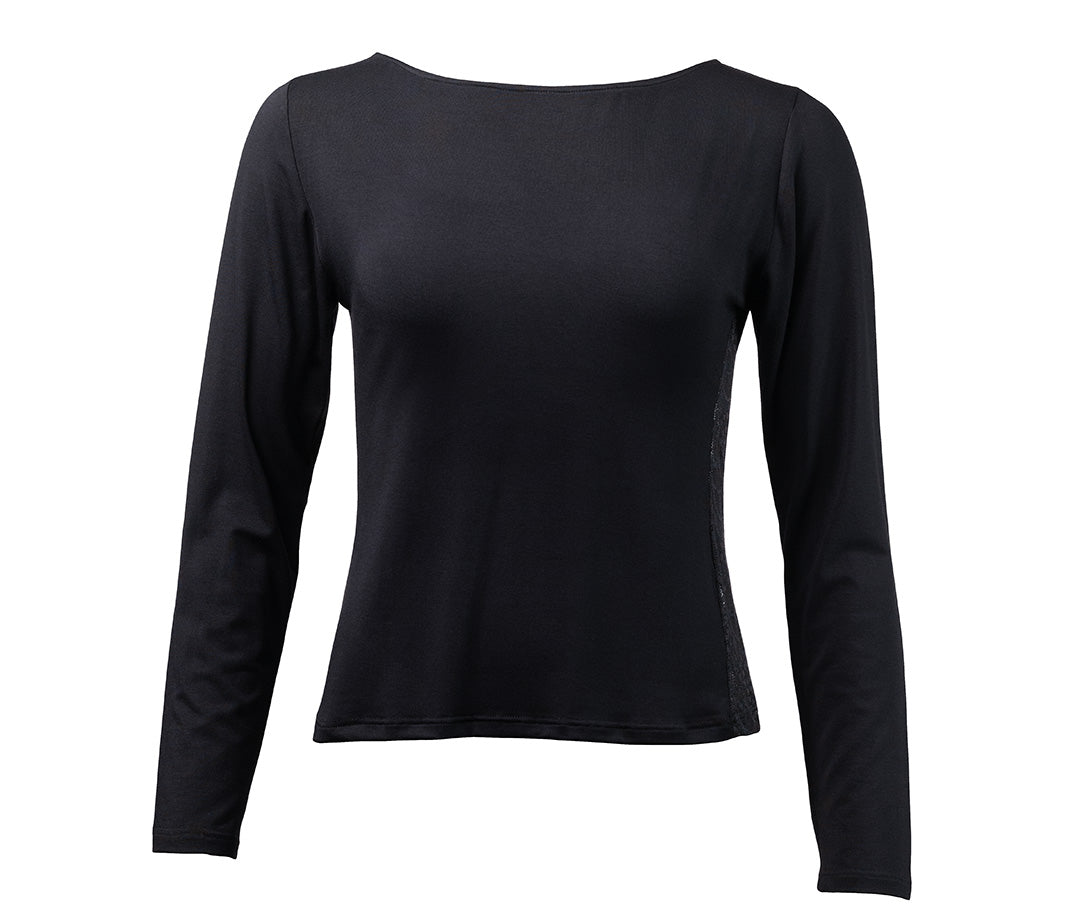 Women's dance top Phila in black with lace detail – for Tango, Bachata, Ballroom and more. The fitted dance top Phila in classic black features an elegant bateau neckline and a subtle lace insert along the left side seam – creating a stylish, feminine look on the dance floor. The figure-hugging cut flatters the silhouette, while the elastic material ensures maximum freedom of movement. This black dance top is ideal for passionate dances like Tango, Kizomba, or Bachata. Perfectly matched with the Tyra skirt, which features a subtle lace accent and elegant front slit. For particularly movement-intensive dance styles that require more leg freedom, we recommend our dance skirts Orla or Vana.