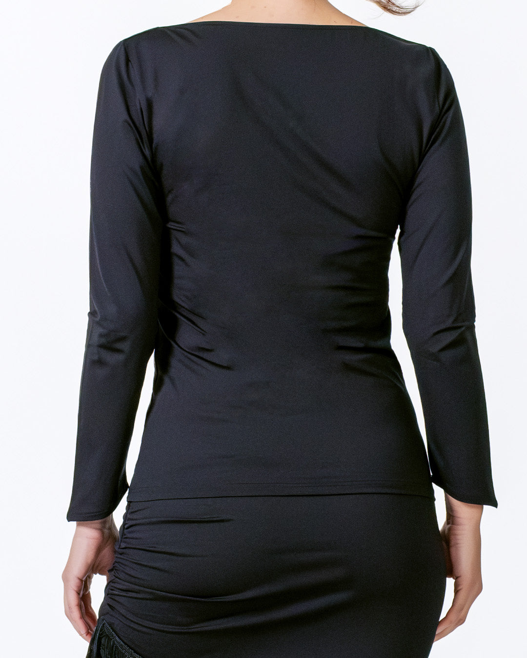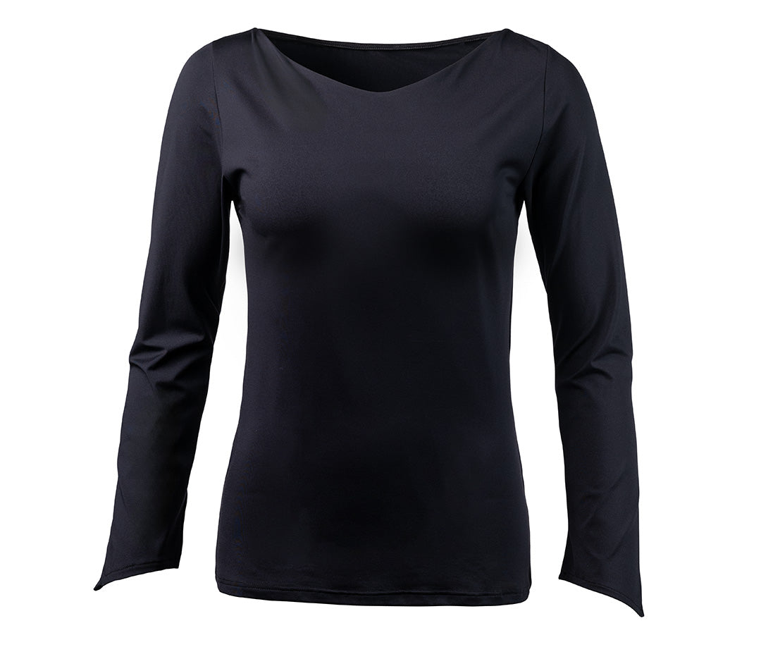 Women's dance top Suki in black with slight V-neck at the front and rounded back neckline. The Suki dance top in classic black features a subtle V-neck at the front and a softly curved, semi-circular back neckline – creating a stylish yet sporty look on the dance floor. The slightly angled sleeve hems and the black, stretch fabric ensure an optimal fit, freedom of movement, and comfortable wear – even during intense dance sessions. This black dance top goes beautifully with the fringed skirt Oya, with asymmetrical hem or the simple wrap skirt Vana.