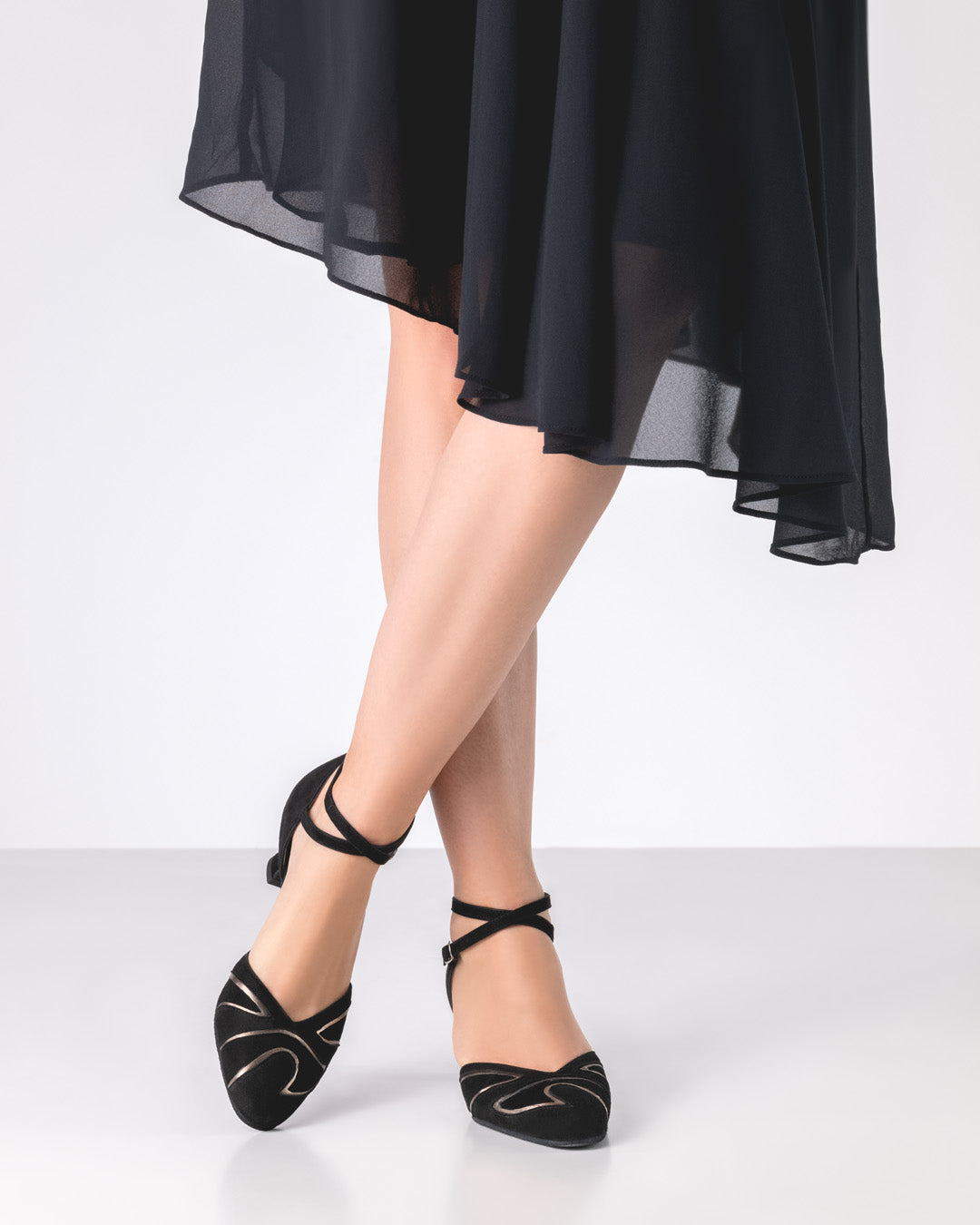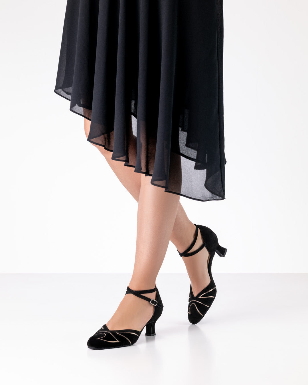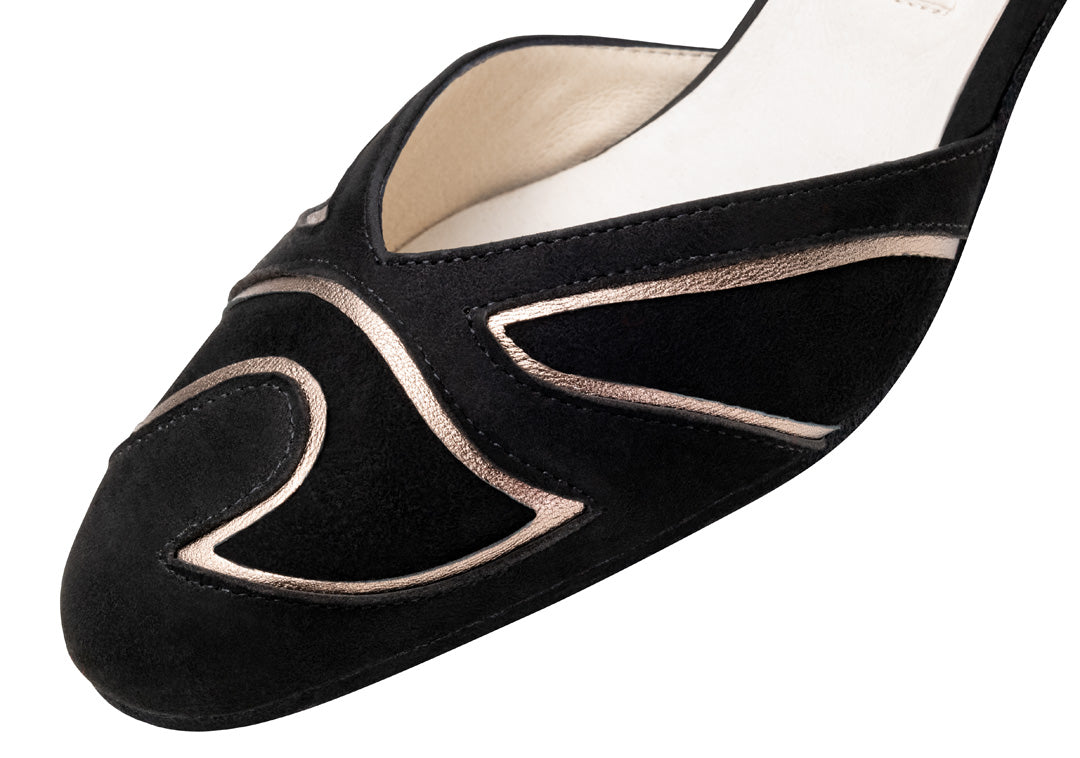 The Heather dance shoe by Werner Kern shines with its refined combination of deep black suede and glossy antique nappa leather inserts. This sophisticated material mix lends the shoe depth, elegance, and a unique presence on the dance floor. The 5.5 cm flare heel and delicate ankle strap ensure secure support and a feminine silhouette. The soft leather lining provides maximum comfort and optimal breathability – perfect for long nights on the dance floor.