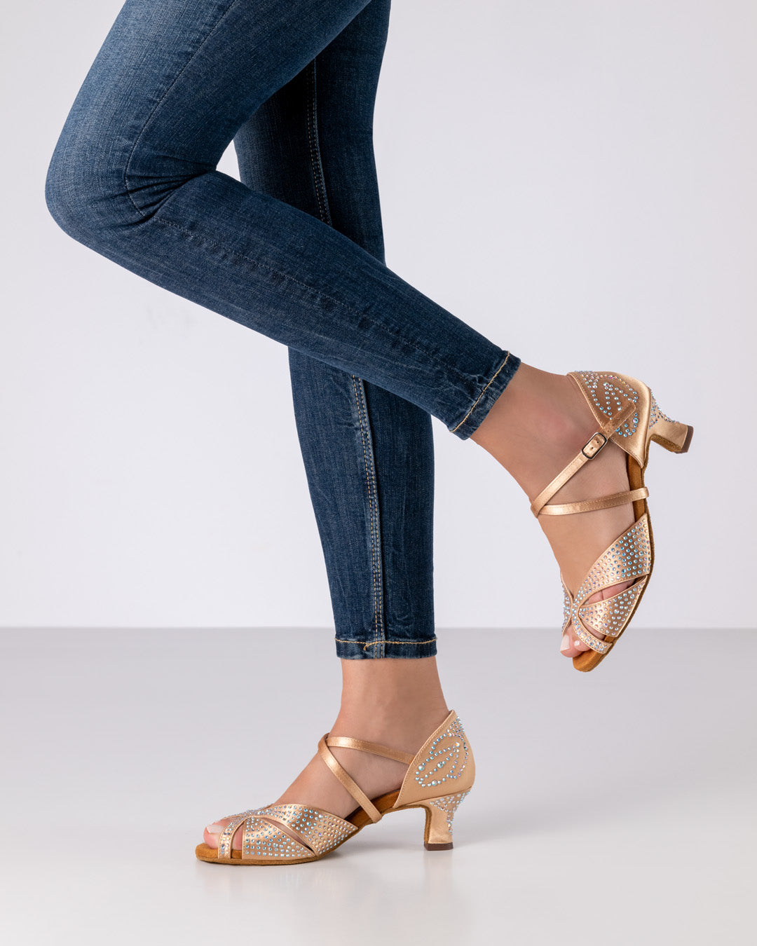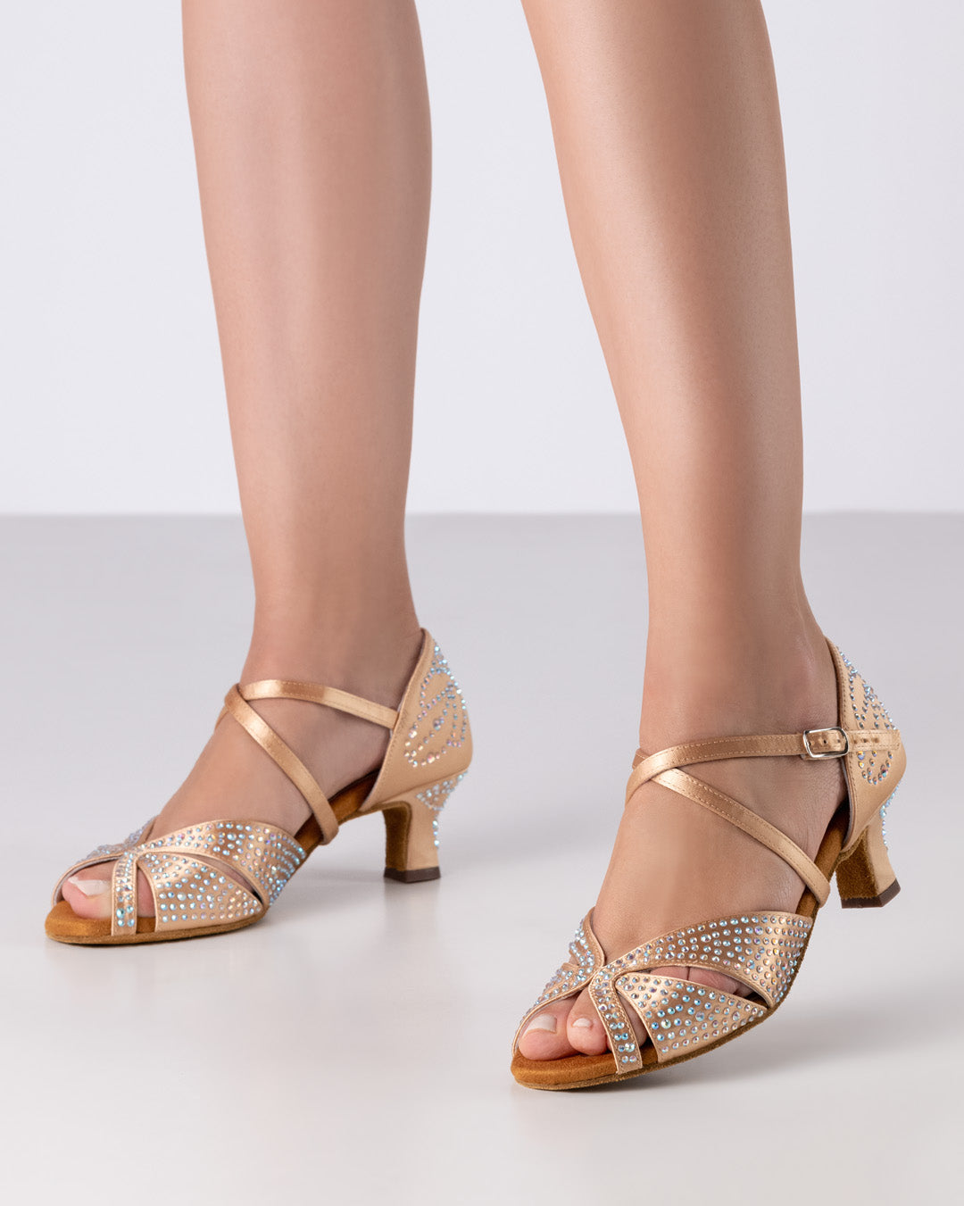 Vianne by Anna Kern is the perfect choice for dancers looking for a harmonious blend of style, comfort, and functionality. In delicate nude satin and adorned with sparkling rhinestones, this shoe adds an elegant flair to every appearance. The crossed straps provide optimal support and emphasize the feminine lines. With its comfortable 5 cm flare heel, the shoe offers a stable base for Salsa, Bachata and Kizomba without compromising elegance. The softly cushioned insole and breathable lining guarantee a pleasant wearing experience – even during long training sessions or dance evenings.