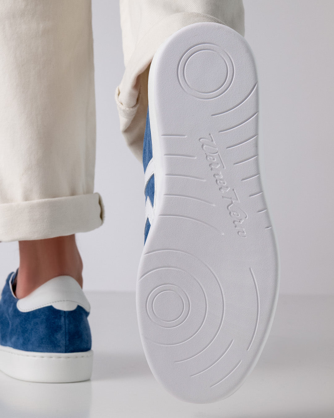 Named after the picturesque port city south of Naples, the Salerno dance sneaker brings Mediterranean flair straight to the dance floor. In elegant denim blue suede, jeans-blue suede, or beige suede with contrasting white nappa leather details, it combines sporty dynamics with casual elegance – making it a true eye-catcher, both when dancing and in everyday life. The innovative PU sole with integrated pivot points enables smooth movements and effortless turns on any surface. Long-lasting comfort is ensured by the high-quality leather lining, the removable insole, and the overall lightweight, flexible construction.